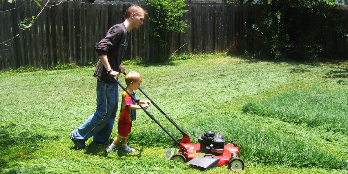 A man and his son mowing the lawn | Source: Flickr