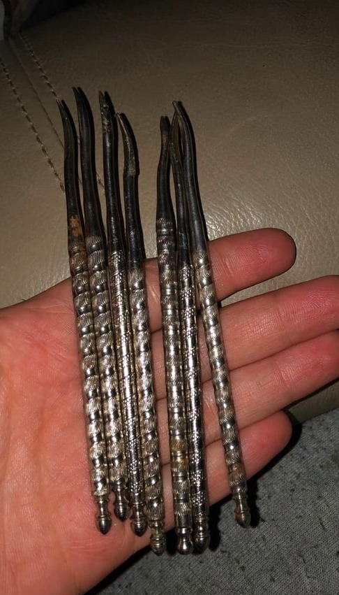 These are used to clean out nut shells – most especially chestnuts! My grandparents had a wooden bowl that looked like a hollowed out tree trunk with holes that held these & a place for a nutcracker as well!