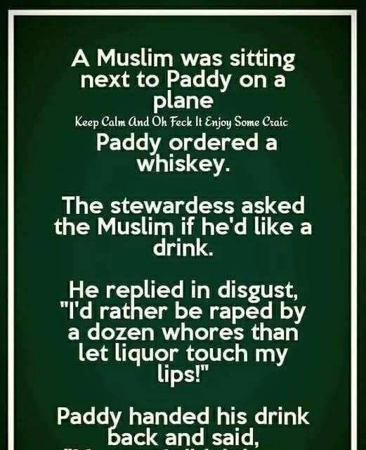 A Muslim was sitting next to Paddy on a plane. Keep Calm And Oh Feck It Enjoy Some Craic Paddy ordered a whiskey. The stewardess asked the Muslim if he’d like a drink. He replied in disgust,
